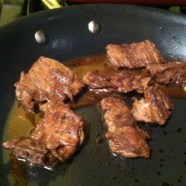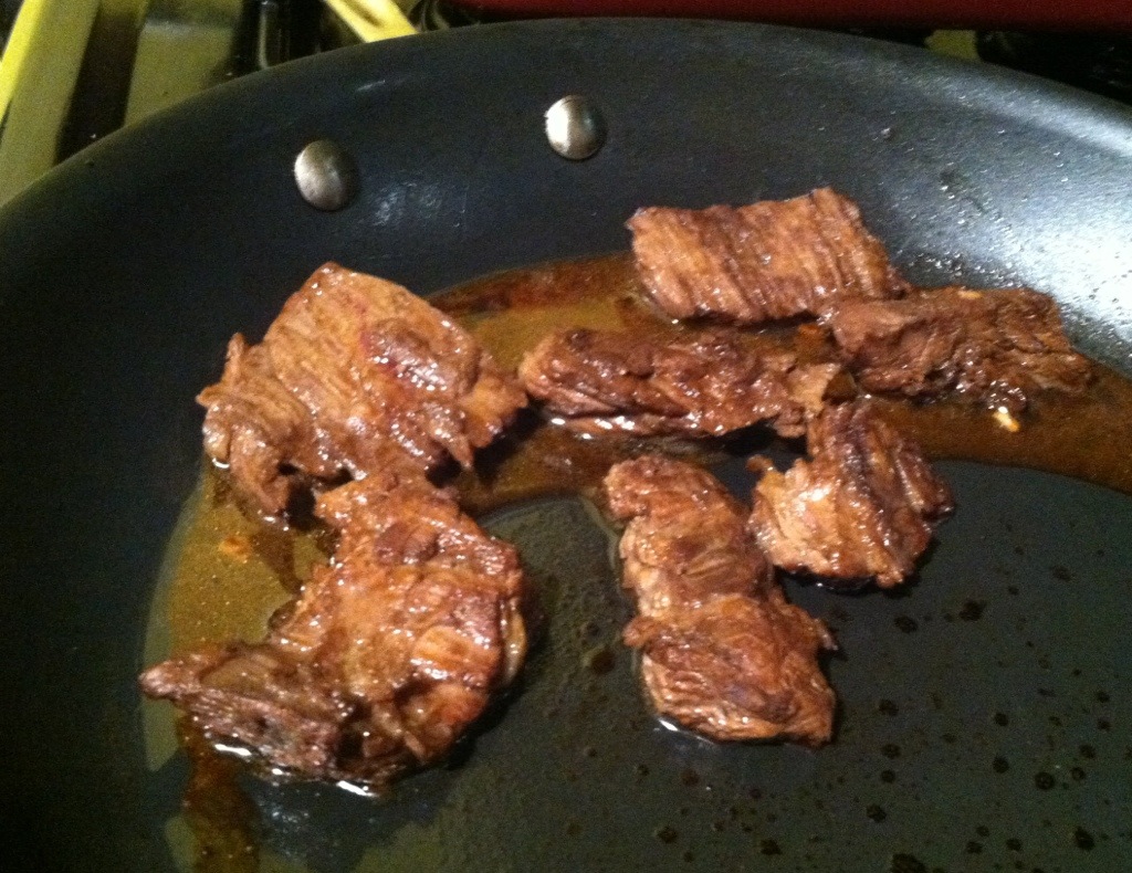 After marination, fry the beef in a pan on medium heat. The skirt steak I got was cut too thick (1/2 inch), so I cooked each side for about 5 mins or so until it was cooked through. (If you prefer, you can cook each side until it’s only a little pink in the middle). You can use a couple tablespoons of canola oil, but you probably won’t need it because the marinade will prevent the meat from sticking to the pan.