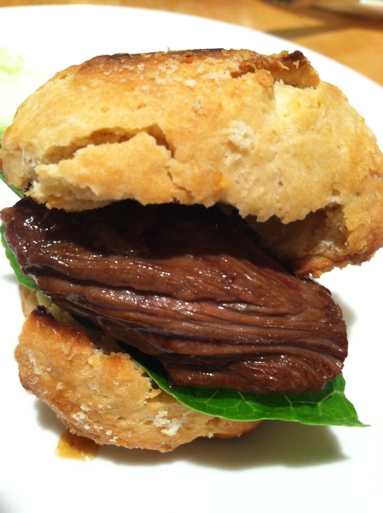 Slice the cooked beef into bite-size chunks, put on rolls and serve immediately. (Please note that while there is romaine on the sandwich shown above, Brant and I thought that greens detract from the deliciousness of the sandwich, so I’m recommending just beef and bread.)