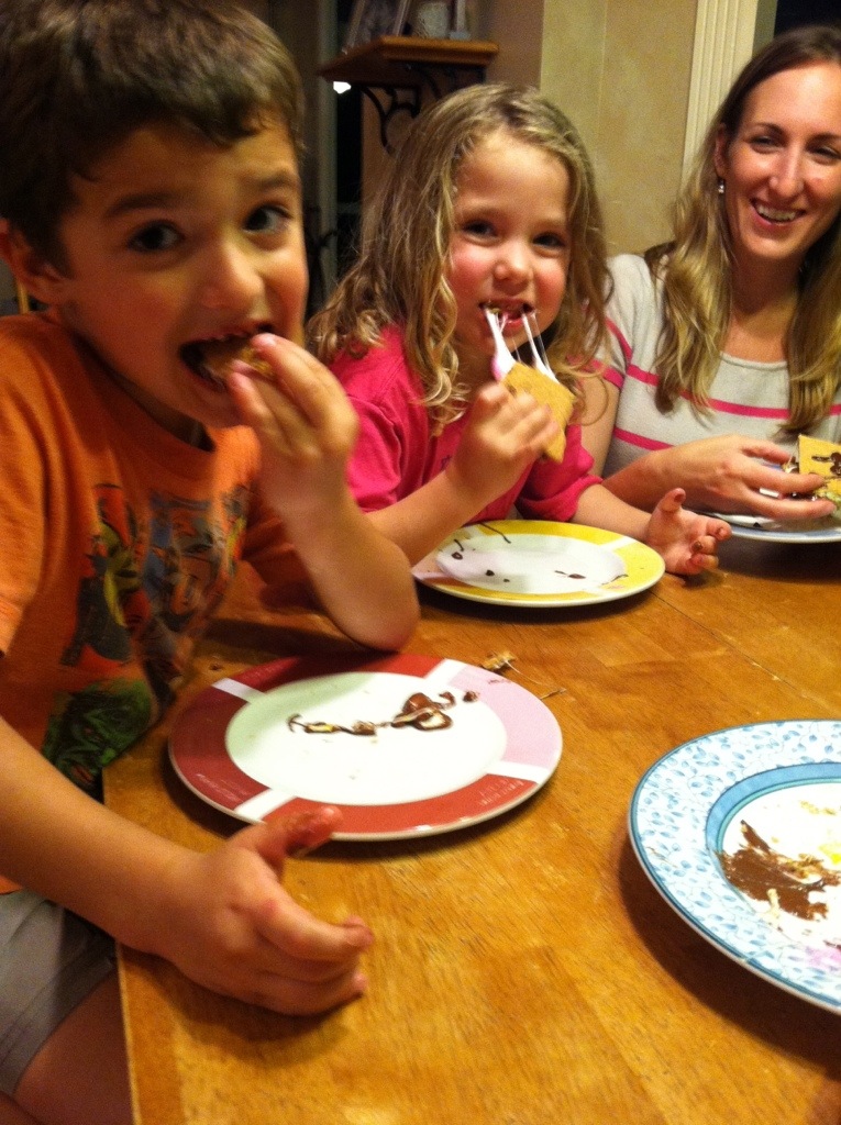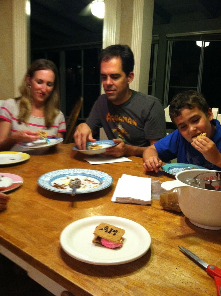 I distracted the kids by showing them how to pipe their initials on their graham crackers while Michelle nuked the plate of S’Marzipan S’Meeps.