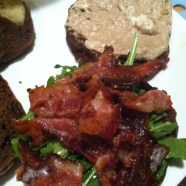 Cost: The mousse ran about $11 for enough to make 24+ servings of the spread alone. I already had the pink peppercorns, pink sea salt and the grape juice, though. Six servings of bacon, arugula and vinaigrette came to about another $15.50, and if you make the bread, that’s $3.25 or so (it might cost more if you buy them).