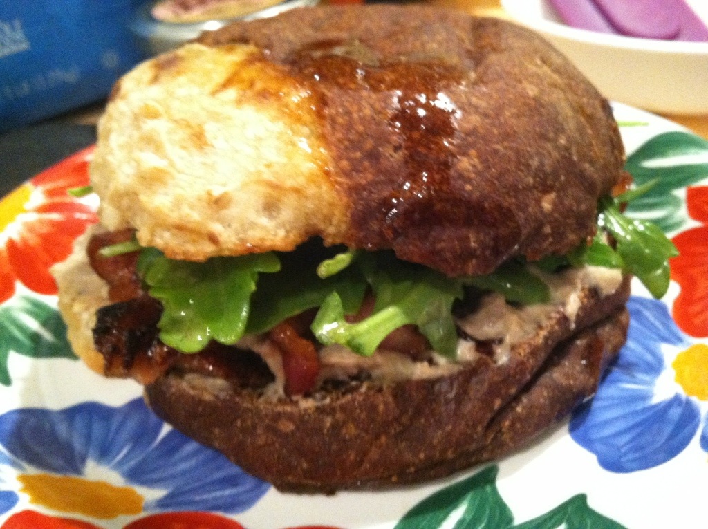 On the bottom half of the rolls, I made beds of arugula about 4 leaves thick, then placed 2 strips of bacon, cut in half, on each. I spread the chicken liver mousse on the top halves, then perched those on the bacon. Super snacky!