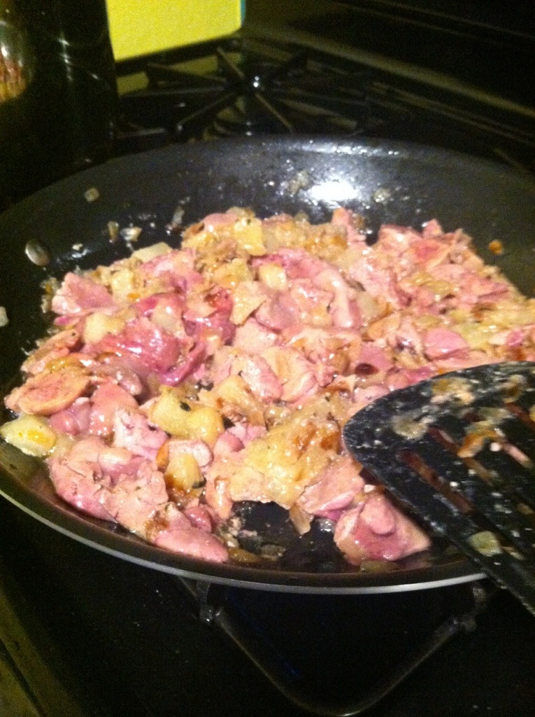 Next, I drained the livers and added them to the pan, removing the lid and upping the heat to medium. I cooked them until they were firm, mostly grey, but slightly pink inside.