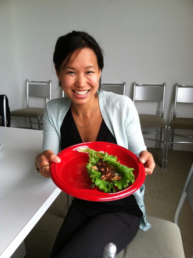 At Grace’s office, I spooned 1 heaping tablespoon of fried rice into the middle of each green leaf, then put 1 or 2 slices of cooked bulgogi and sprinkled about 5-7 tiny kimchi chips on top. Cost for each wrap was about $1.25-$1.50.