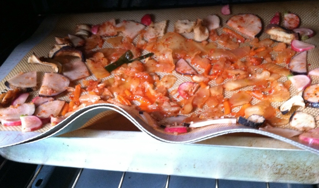 Once the kimchi radish pickles were ready, I spread them and the kimchi cabbage out on a Silpat mat at 275˚.