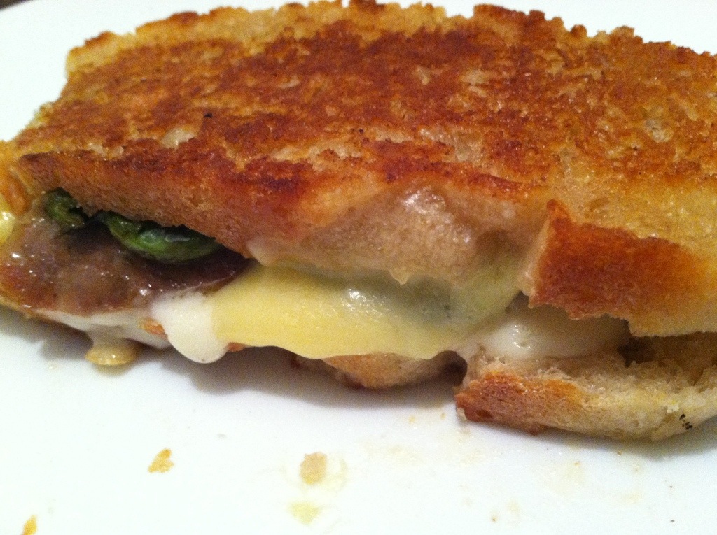 Once it does, using two spatulas, gently turn the sammy over and cover again. When the other layer of cheese melts and the bottom layer of bread is a golden-orange color, it’s ready to eat!