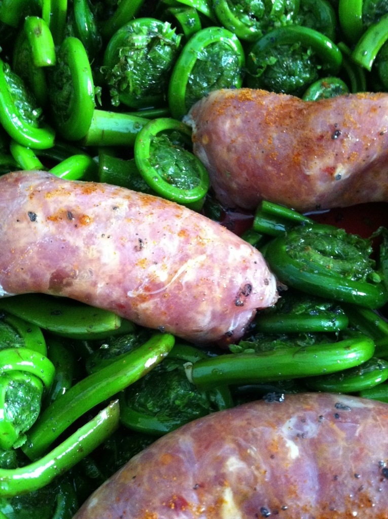 ROASTED FIDDLEHEAD FERNS AND HOT TURKEY SAUSAGE