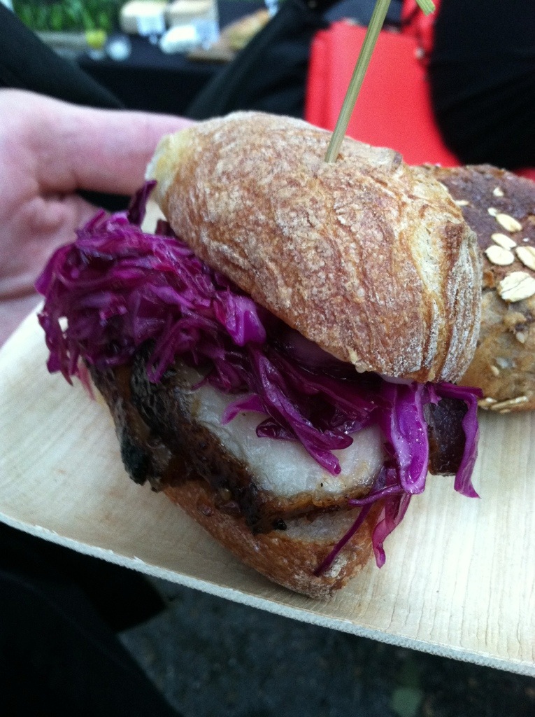 I wasn’t expecting anything less, but the spread was fabulous. I stuffed myself on the cranberry nut bread, the duck rillette, the sopressata, the smoked pork belly and the made-for-the-event mortadella sammy with robiola cheese, roast garlic puree, pickled red onion and arugula. Click here to see Tom Colicchio put one together.