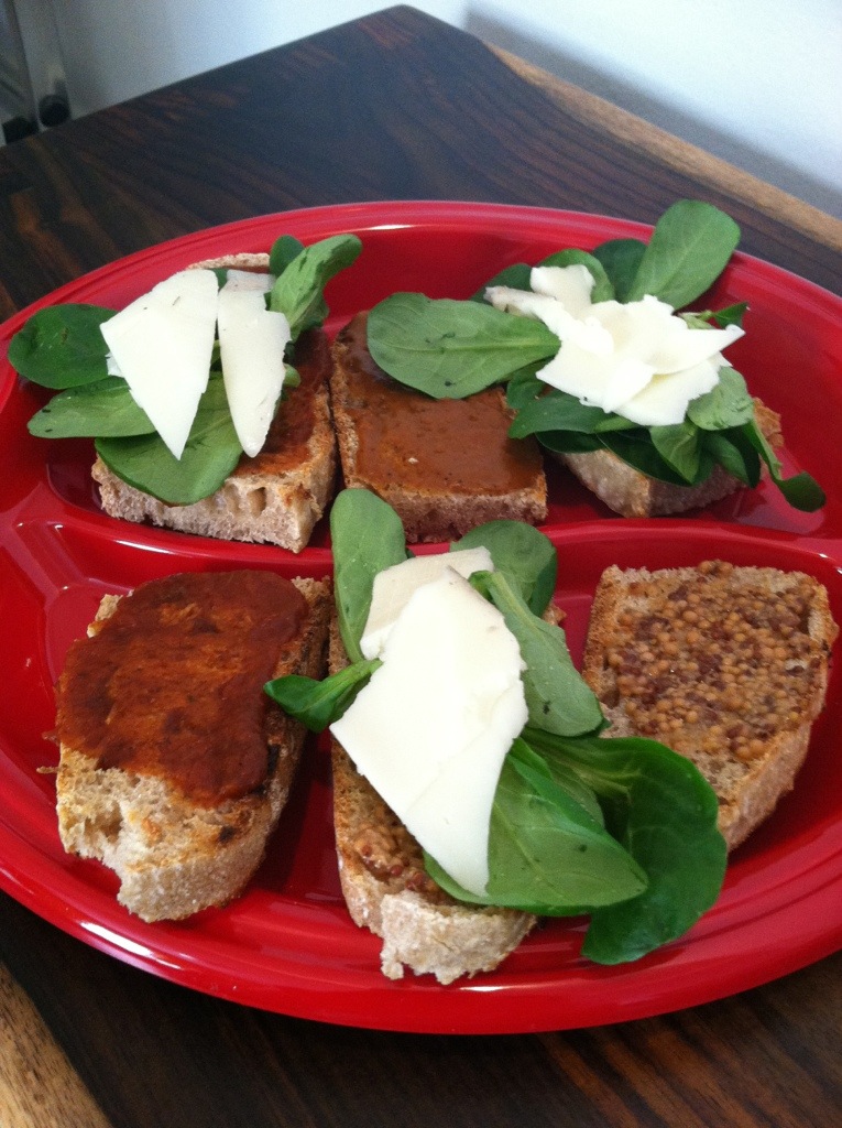 I hurried upstairs, washed and trimmed the mache, toasted six small slices of sourdough, smeared each pair with a different condiment, and topped three pieces with the mache and sottocenere cheese.