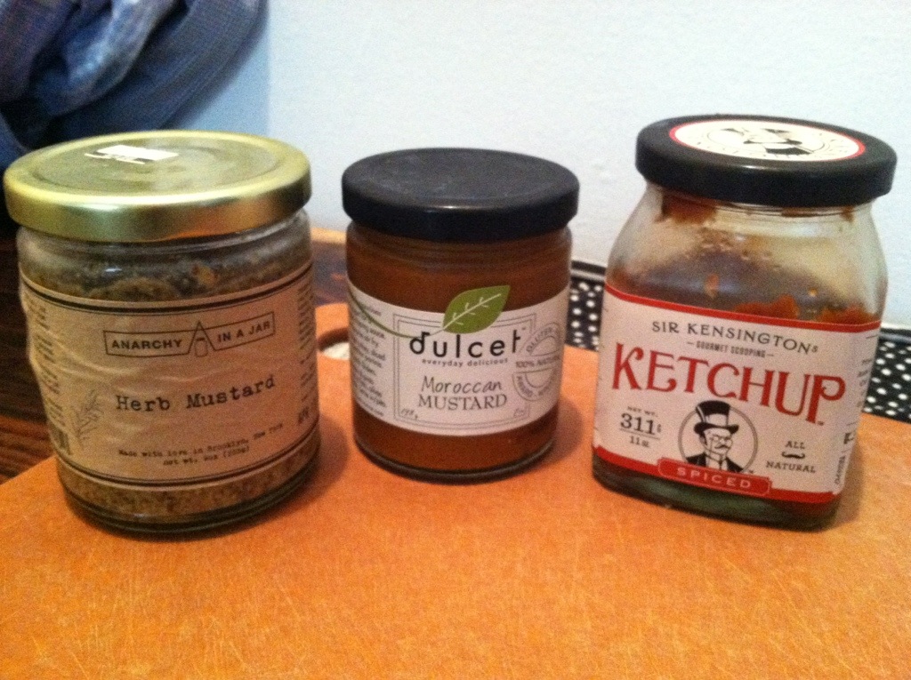 At Whole Foods, I had went to town on the condiment aisle. Instead of yellow mustard (which tastes a little like pencil lead to me now), I bought Dulcet Moroccan Mustard and an Herb Mustard by Brooklyn company, Anarchy in a Jar, along with my trusty Sir Kensington’s Spiced Ketchup.