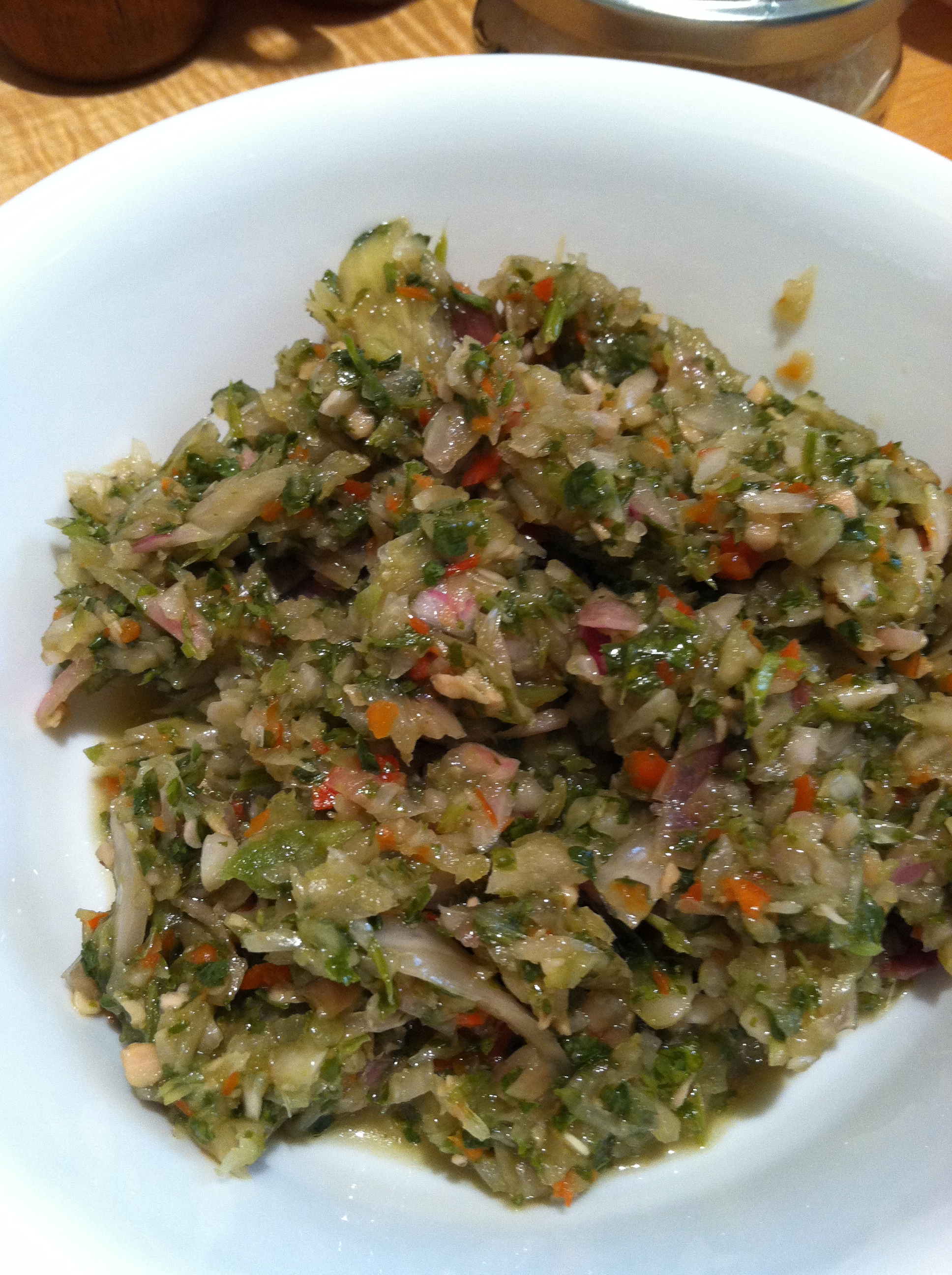 9 T. finely minced mix of fresh Serrano peppers and little hot red peppers, with seeds removed from 2/3 of the batch (or to taste)