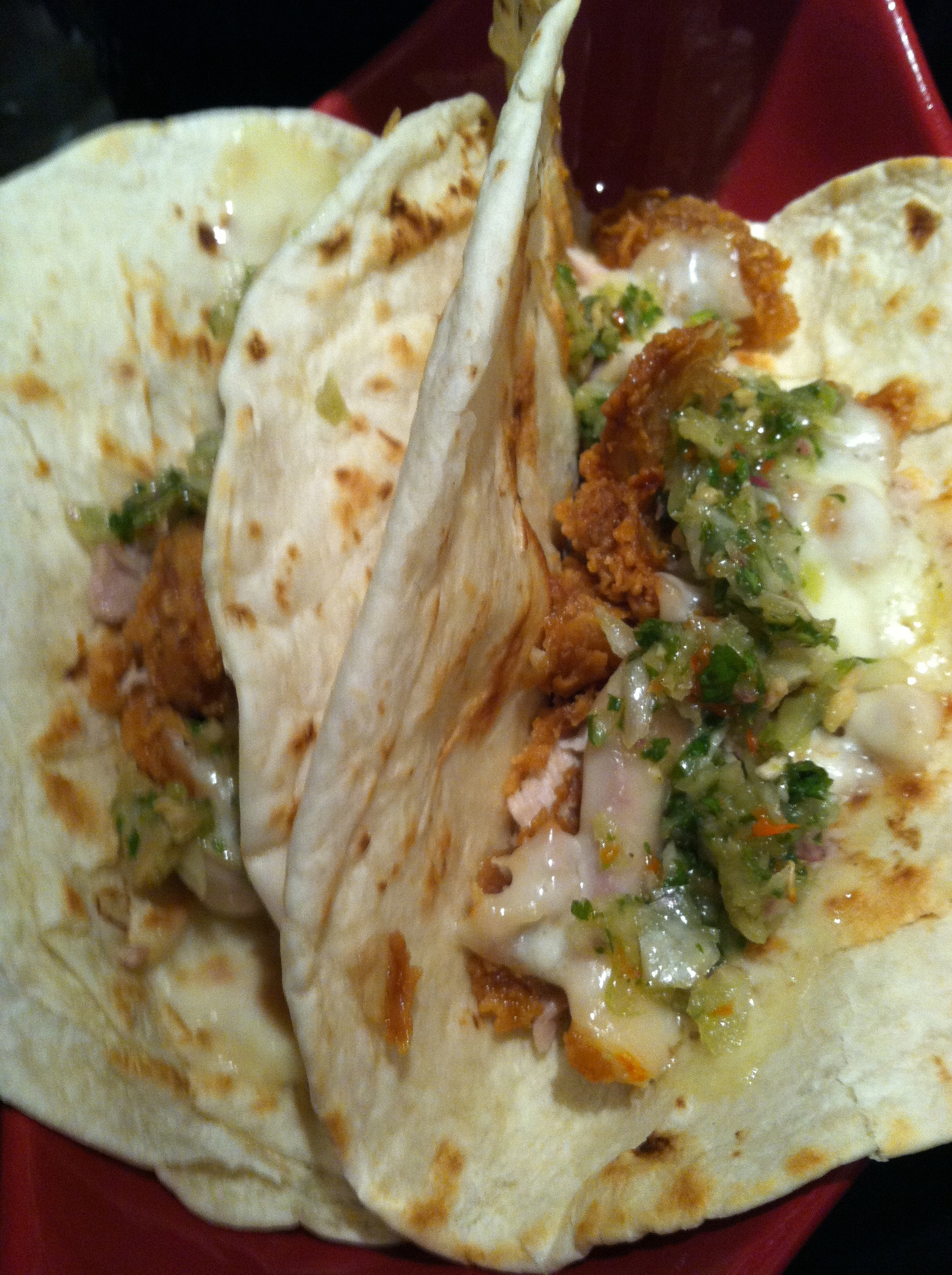 In honor of Gustavo Fring’s “piquant” and “zesty” Chilean fried chicken made for a Mexican clientele, I filled tortillas with shredded spicy fried chicken and melted Monterey Jack, and topped them with a traditional Chilean fresh minced pepper condiment called pebre.