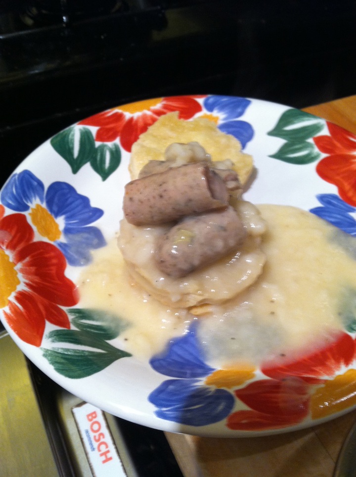 It’s a riff on the British dish, bangers & mash (i.e., sausages and mashed potatoes), and one of Miley’s favorite foods: chicken & dumplings from Cracker Barrel. I put everything on a buttery biscuit …
