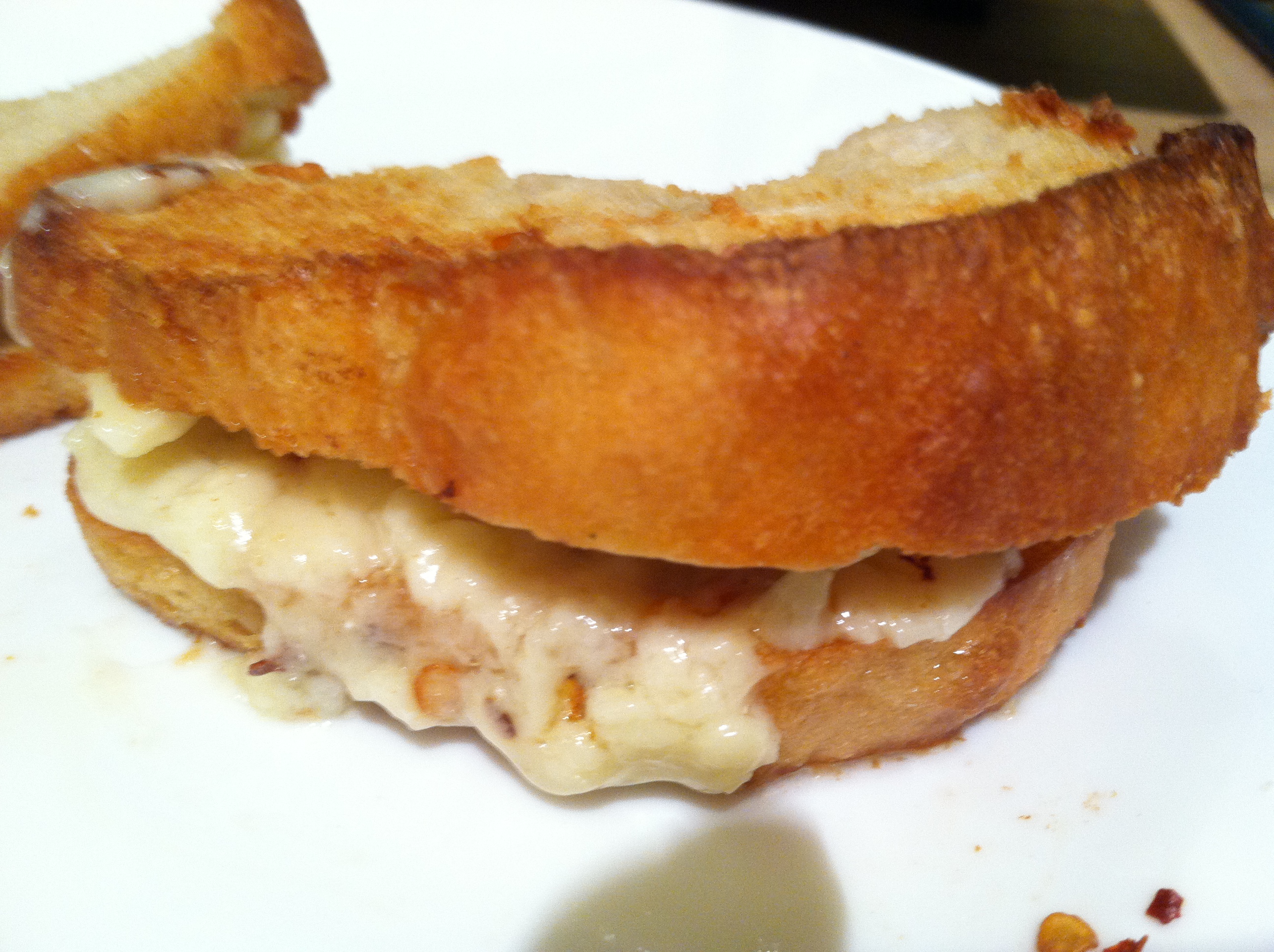 THE RECIPE: Instead of pan-frying the bread and fillings in butter, I cheated by toasting the bread, then nuking the toast with slices of Cougar Gold, sprinkling the pepper flakes or fennel seeds on top and folding them in half.