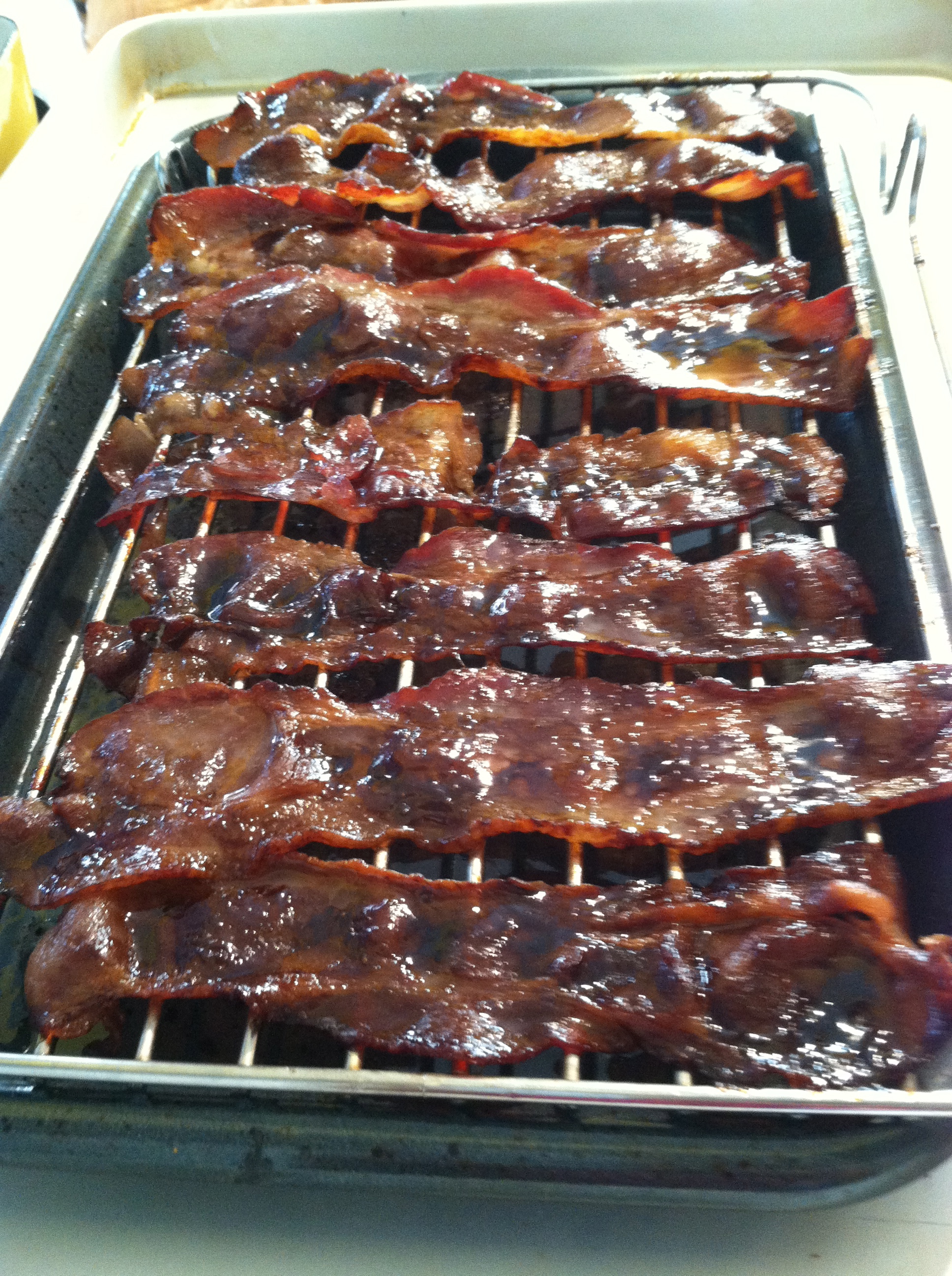 (The bacon strips won’t be crispy, but instead will be slightly candied and chewy, the way I like ’em.)