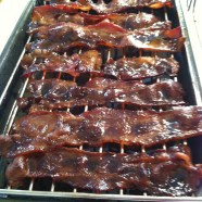 Lay bacon slices on silpat-lined baking sheet (with edges, so the bacon fat doesn’t drip off). Squeeze a thick line of glaze onto each side of bacon, and spread evenly on slice using a silicone pastry brush.