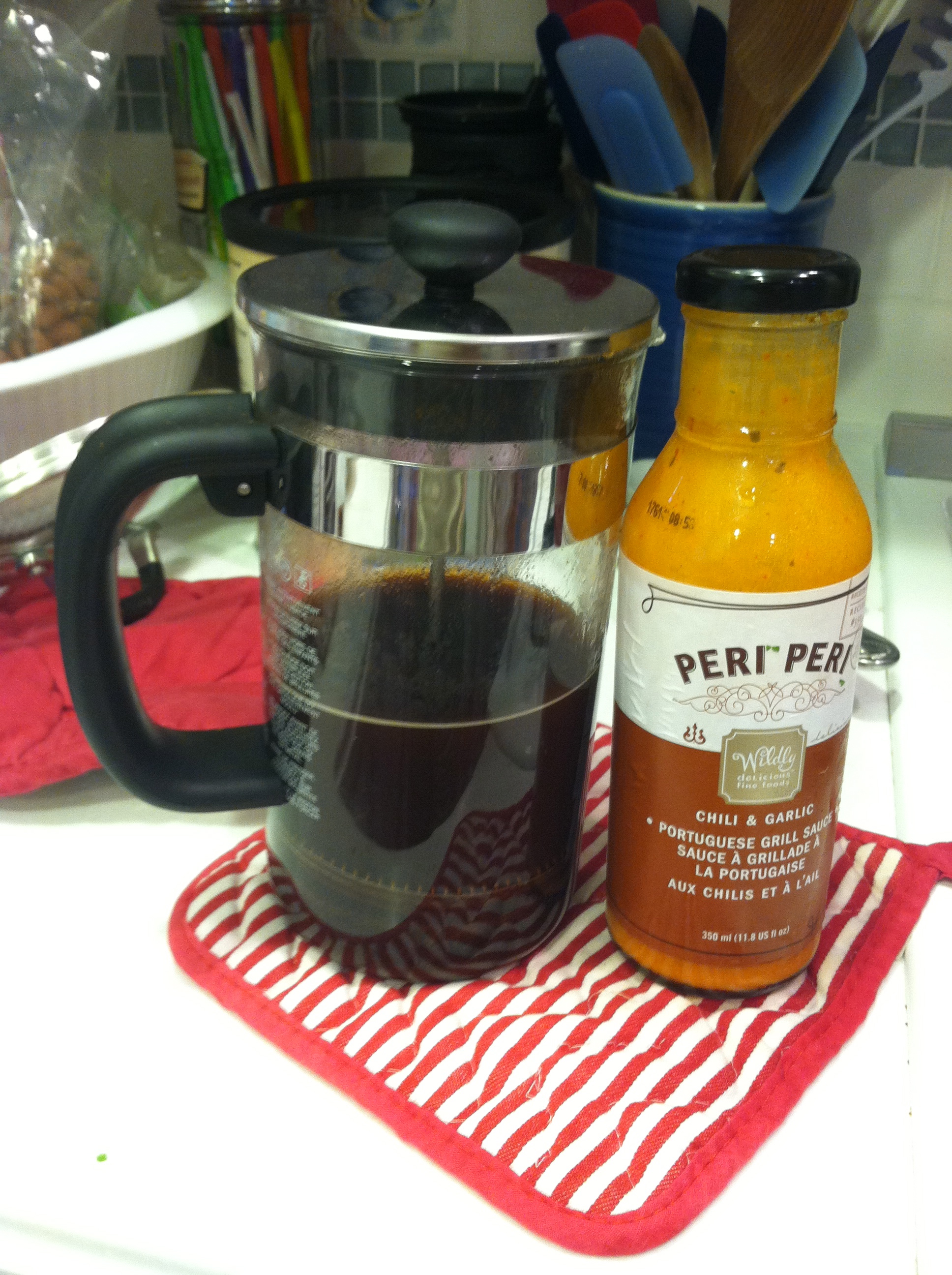 Pour half a bottle of Peri-Peri sauce into the bowl. Add 6-8 oz. of freshly brewed, double-strength plunger pot coffee, and stir until combined.