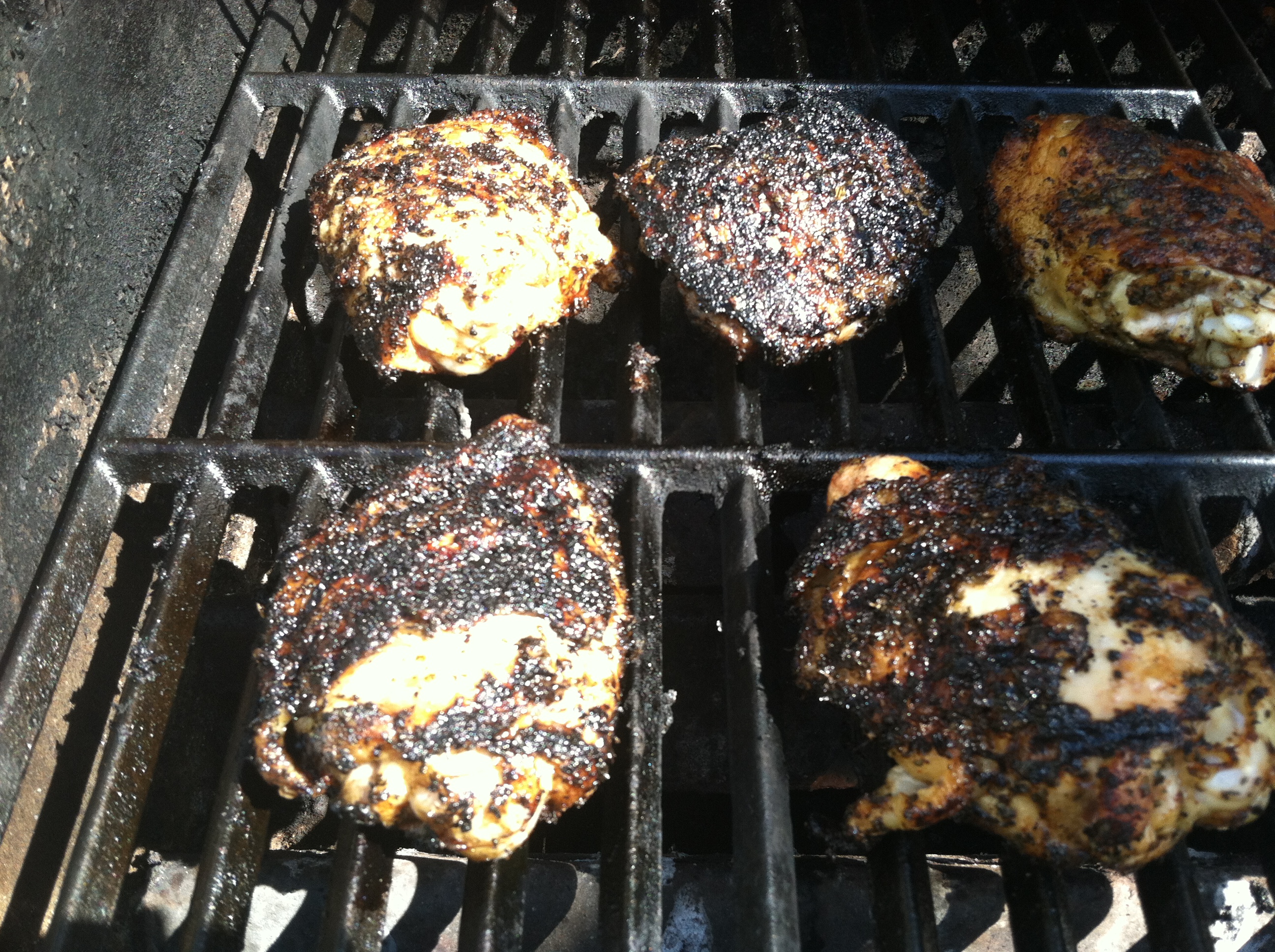 Get grill marks and crisp up the skin on the thighs at around 600˚ for 5 minutes on each side, then lower the heat to 350˚ and grill until cooked through, about 20 mins on each side.