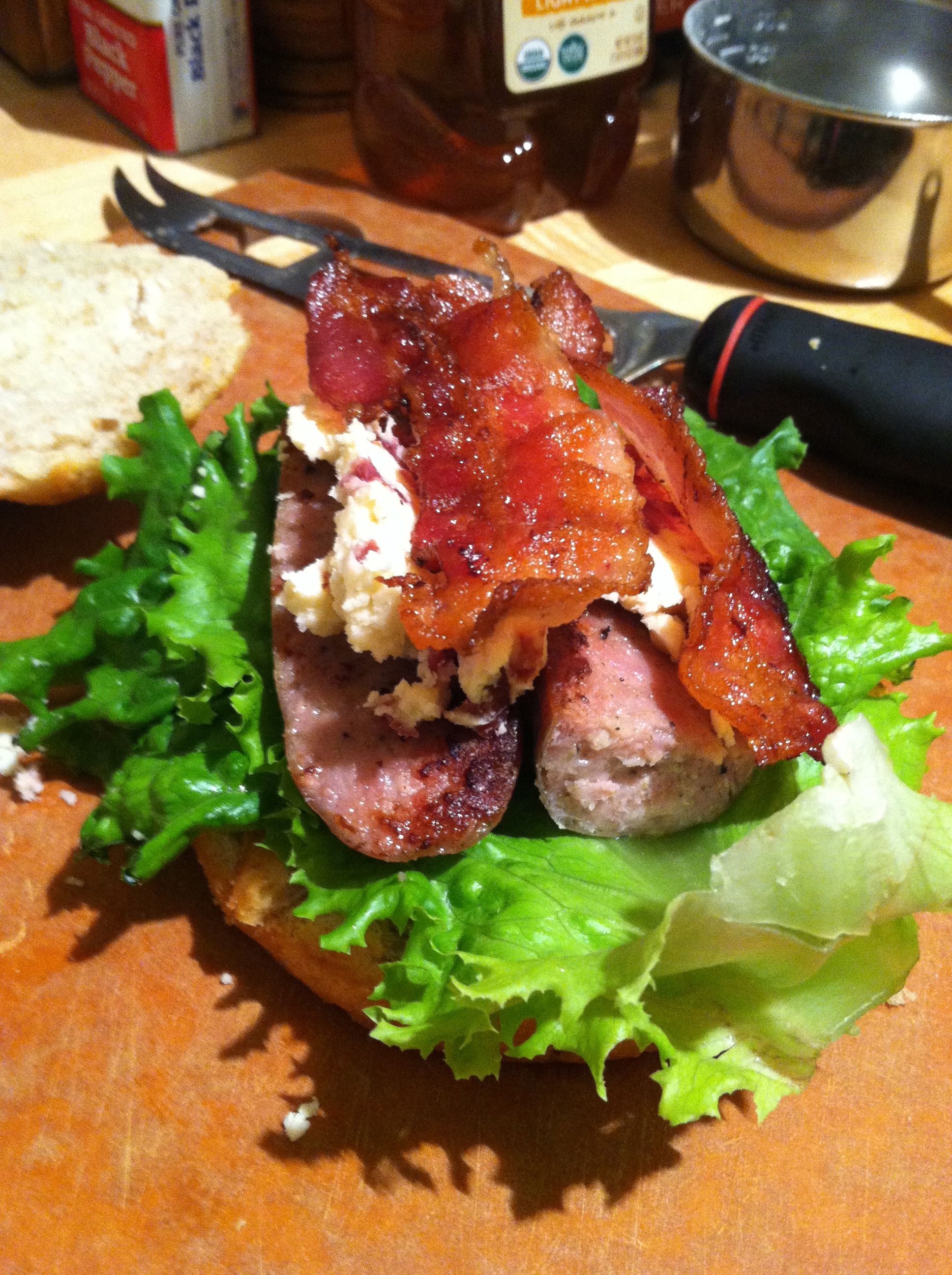 I cooked the bacon and browned the brats on separate halves of a two-burner griddle pan.