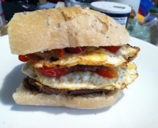Keeping it cheap and simple for a busy week and for marathons of March Madness! Here’s the sammy, on a Kilauea black sea salted, slightly sourdoughed baguette: DOUBLE STACK STEAK & EGGS WITH HOT CHERRY PEPPERS: Thinly sliced beef (you can use Steak-umms or roast beef, or carve up some leftover steak) 2 Eggs per […]